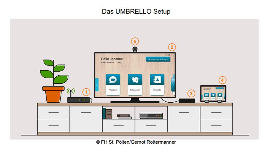 Die Basis von UMBRELLO ist eine TV- und tablet-basierte Plattform, die im Rahmen der Vorgängerprojekte (Brelomate 1 + 2) entwickelt und in einer ausführlichen Feldstudie in 40 Haushaltgen getestet wurde. Das Setup macht den Fernseher zum benutzer/innenfreundlichen Herzstück der Digitalen.Dorf.Dienste. Für den Aufbau zu Hause werden nur wenige Komponenten benötigt (Abb. 1):