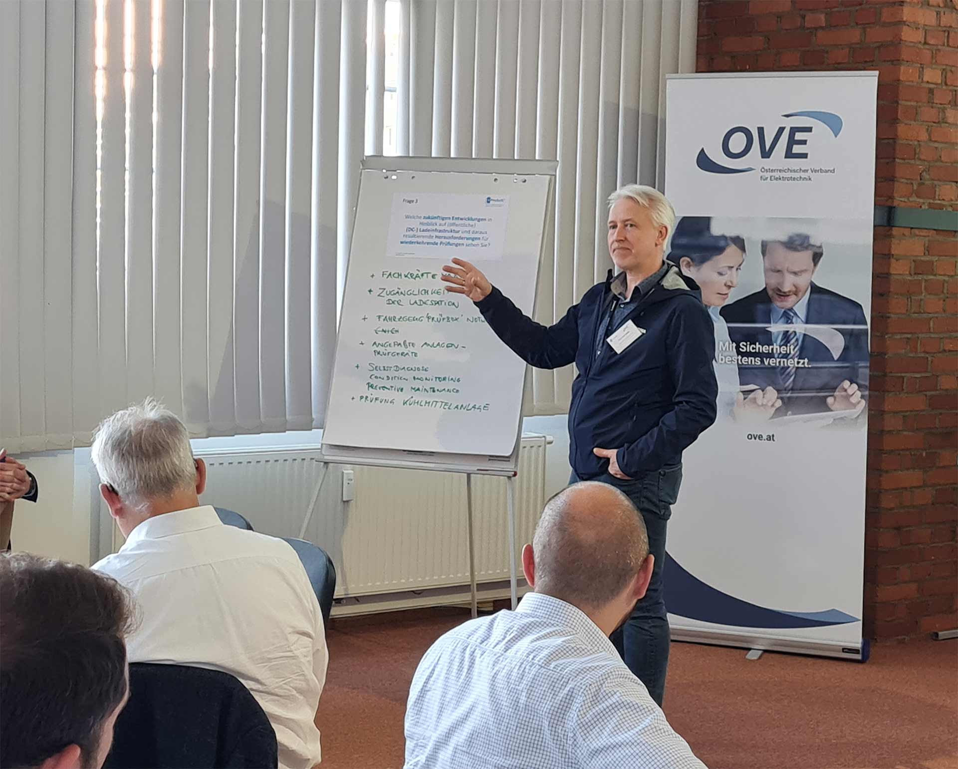 Im Anschluss stellte Daniel Stahleder vom Projektpartner AIT die Test Cases für die wiederkehrende Prüfung von DC-Ladestationen vor, welche im Rahmen des Projekts ProSafE2 entwickelt worden sind. Bei einem Workshop in Kleingruppen war dann die Meinung der Teilnehmer:innen zu diesen Test Cases gefragt.