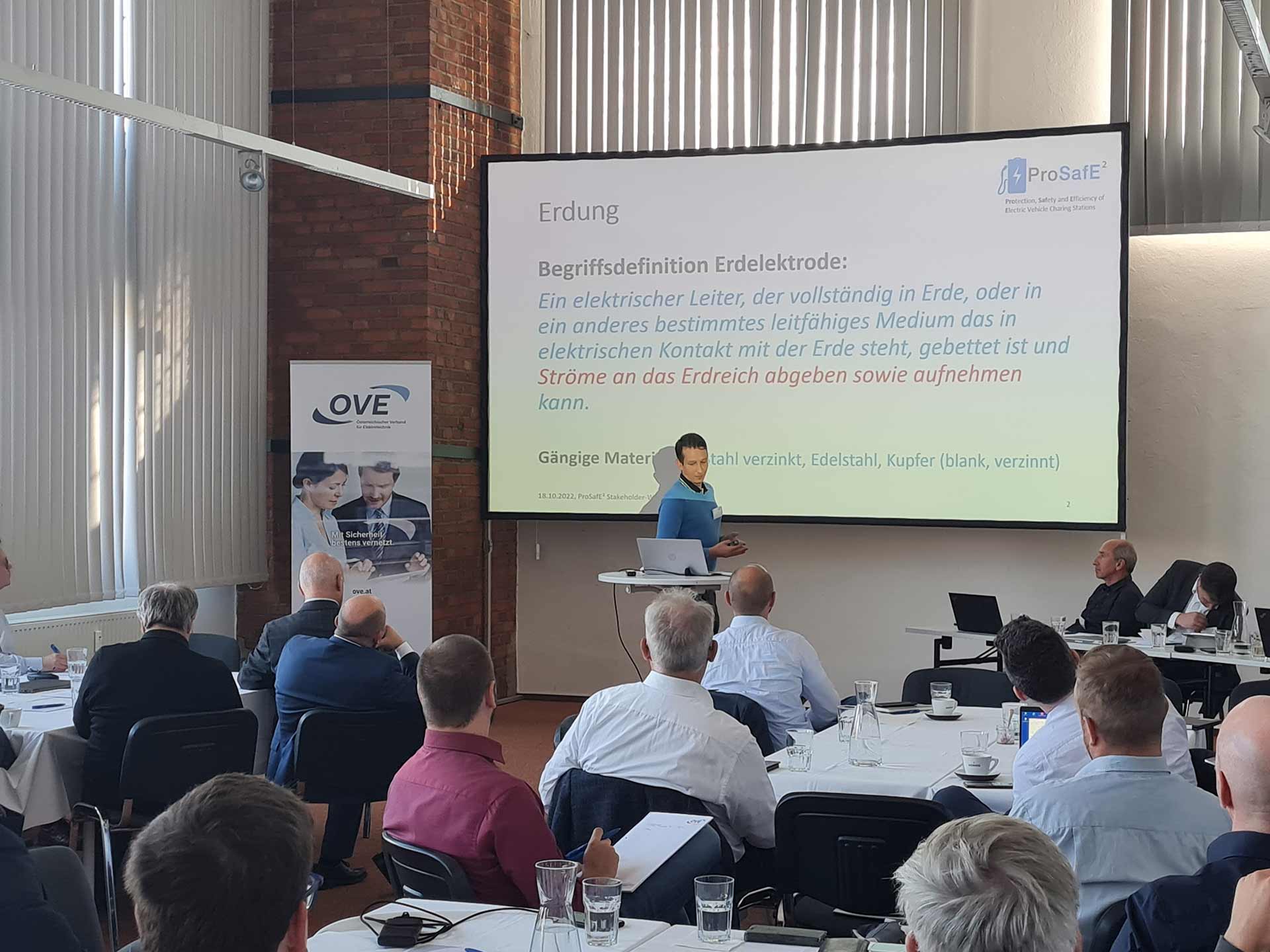 • Martin Fürnschuß, Universitätsassistent am Institut für Elektrische Anlagen und Netze an der TU Graz und Projektmitarbeiter, gab einen Einblick in die Themenfelder „Erdungs- & Potentialausgleichsanlagen bei DC-Ladestationen“. Im Anschluss wurden Fragen zum Thema diskutiert.