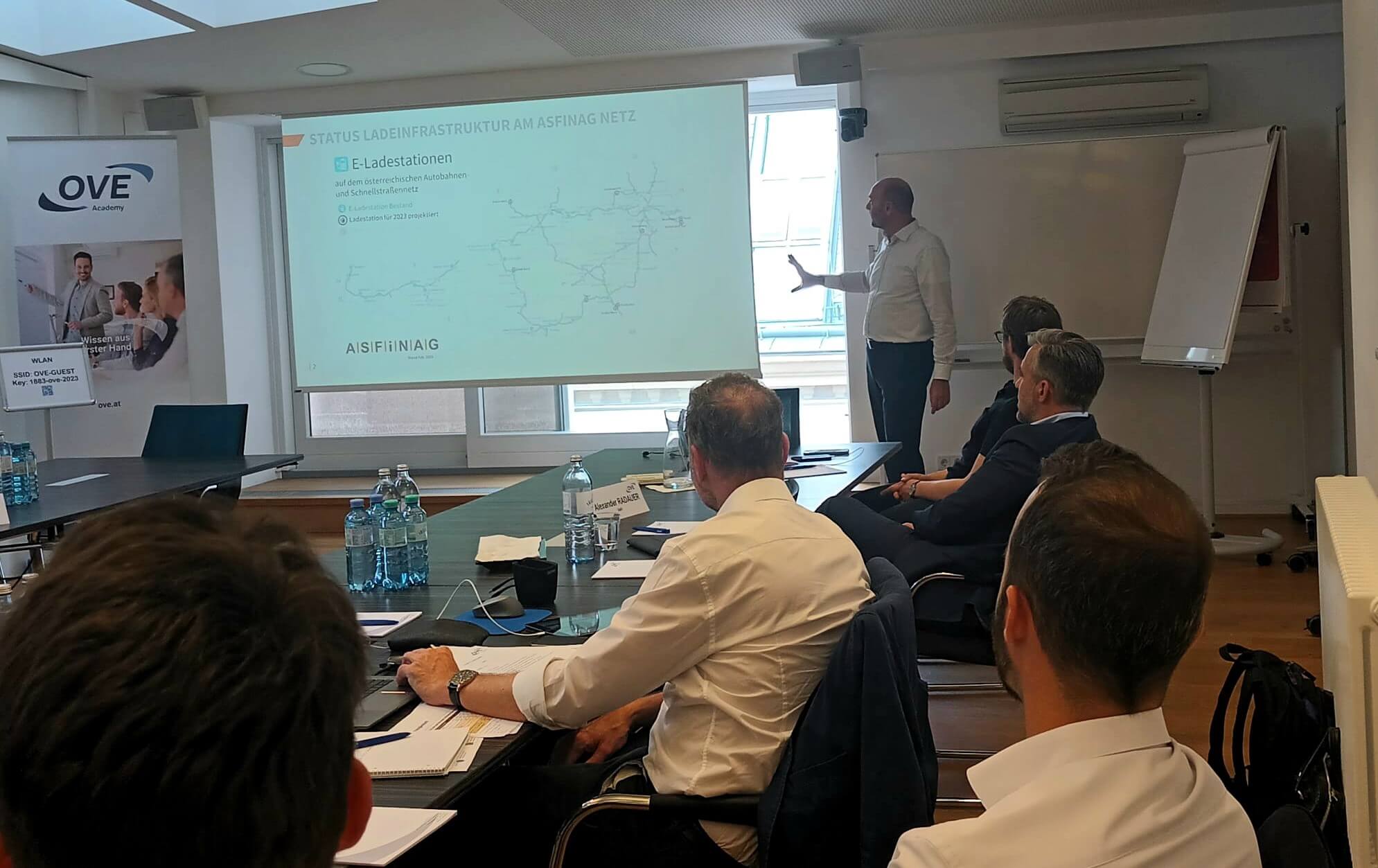 Bernhard Hintermayer von der ASFINAG gab den Teilnehmer:innen einen Überblick über den Ausbau der E-Ladeinfrastruktur: 36 Ladestandorte mit insgesamt rund 220 Ladepunkten sind aktuell in Betrieb, der durchschnittliche Abstand beträgt rund 62 Kilometer.