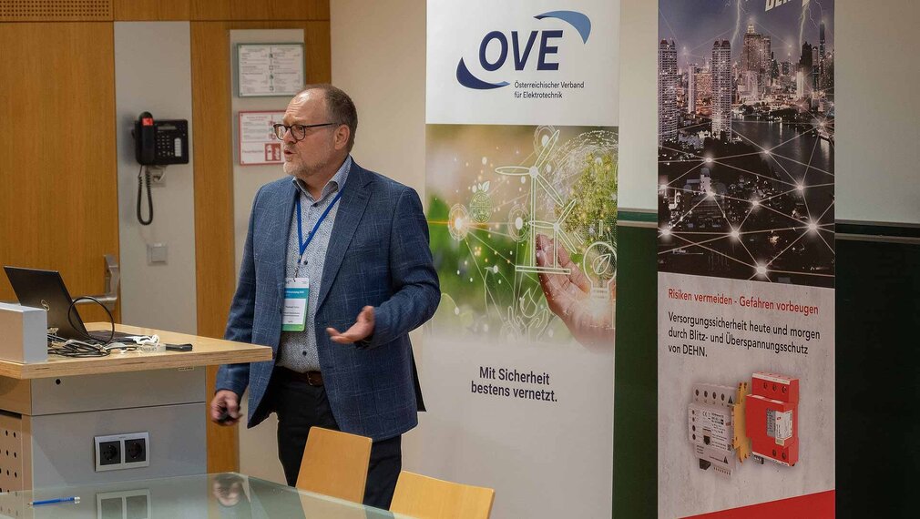 Zur Berechnung des Trennungsabstandes, dem Sicherheitsabstand zwischen metallischen Gebäudeteilen und dem äußeren Blitzschutzsystem, zog er die ÖVE/ÖNORM EN 62305-3 heran und zeigte, welche Einflussgrößen (Stromverteilung (kc), Werkstoff im Zwischenraum (km) und Schutzklasse (ki)) dabei berücksichtig werden müssen.