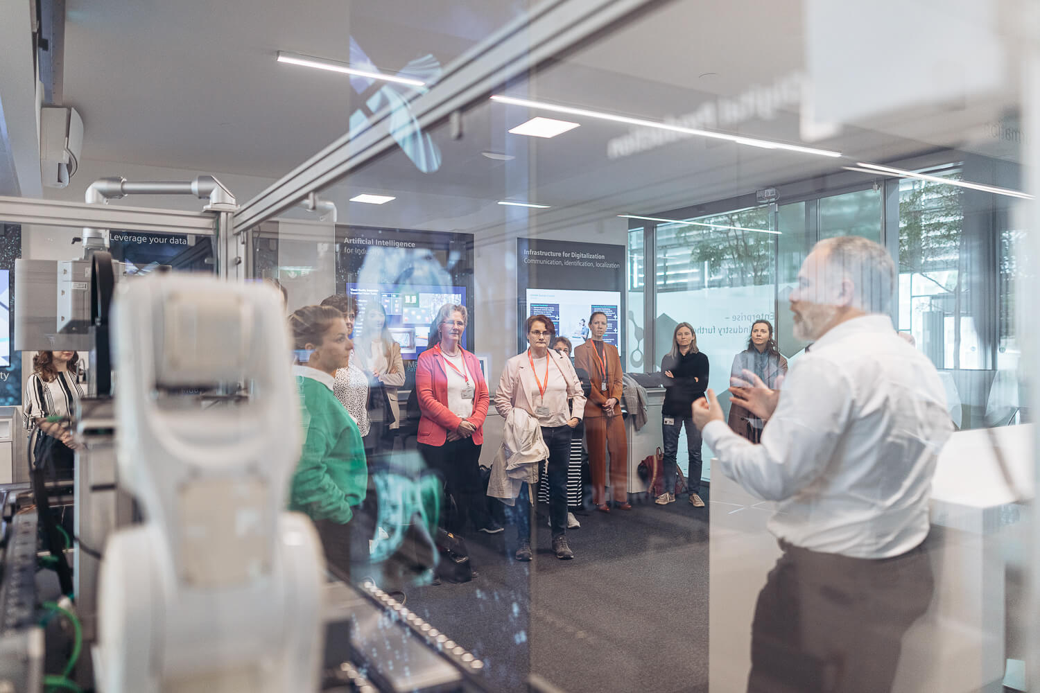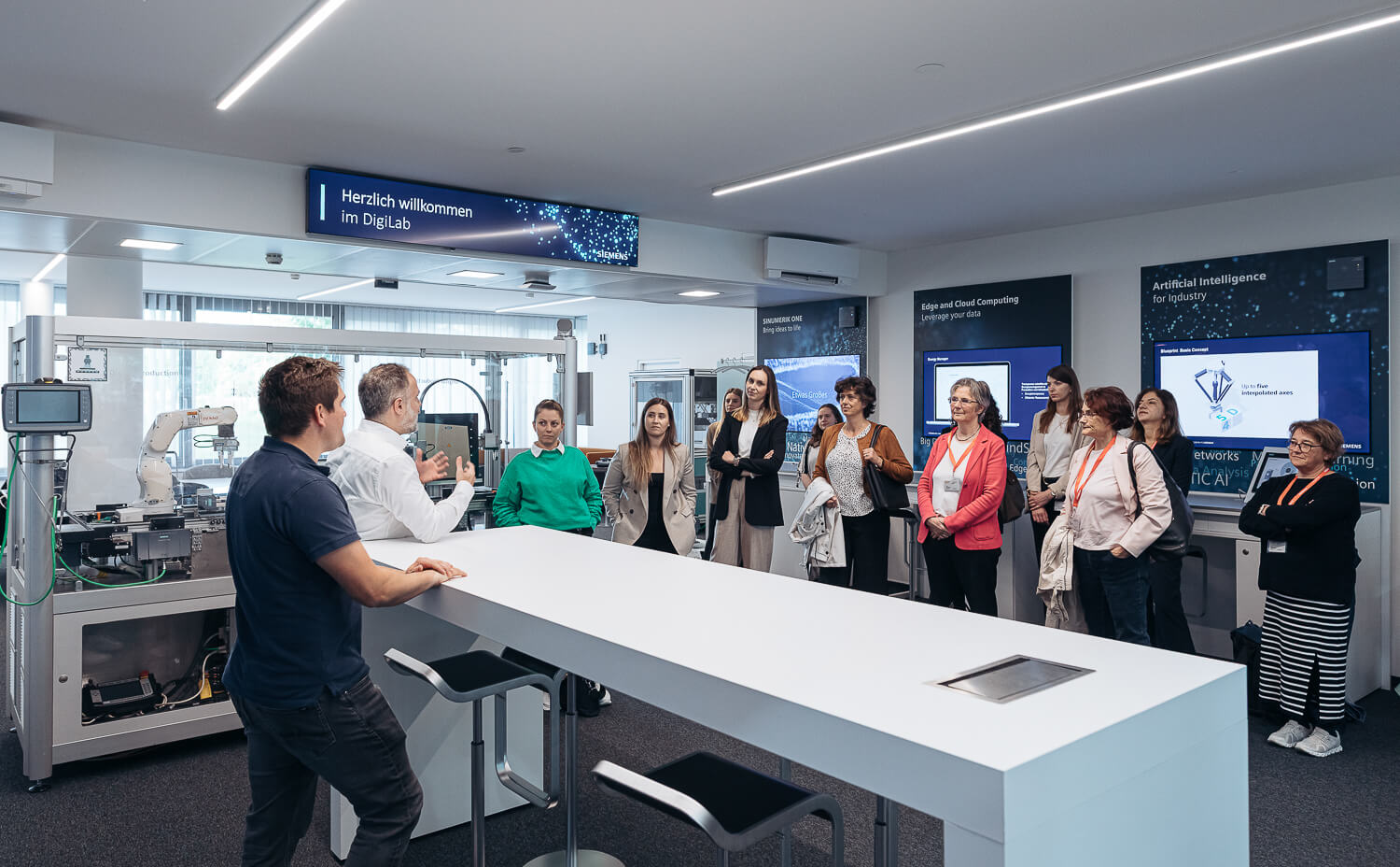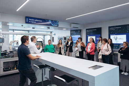 Vor dem gemütlichen Networking-Teil standen zwei Laborbesichtigungen auf dem Programm: Im DigiLab, geleitet von Lukas Gerhold, konnten die Damen Technologien wie Künstliche Intelligenz und Edge Computing erleben, die die Produktion der Zukunft prägen. Die zahlreichen interessierten Fragen wurden von Lukas Gerhold und seinem Kollegen Daniel Dräxler ausführlich beantwortet.