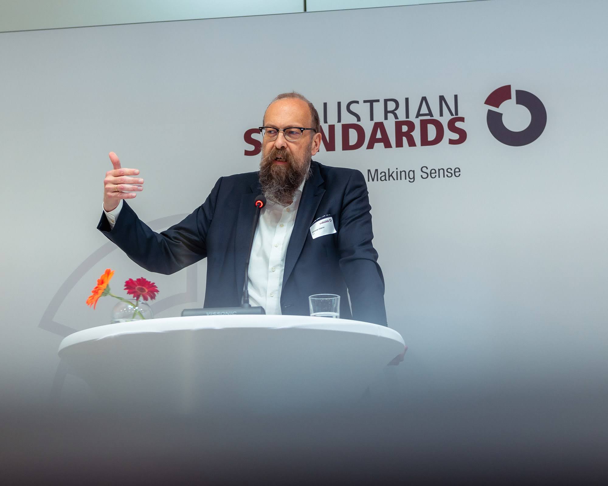 Gemeinsam mit Valerie Höllinger, CEO von Austrian Standards, begrüßte Bernhard Spalt, Leiter OVE Standardization, die zahlreichen interessierten Teilnehmer:innen. In seinem Statement ging Spalt vor allem auf die Bedeutung von Zusammenarbeit ein.