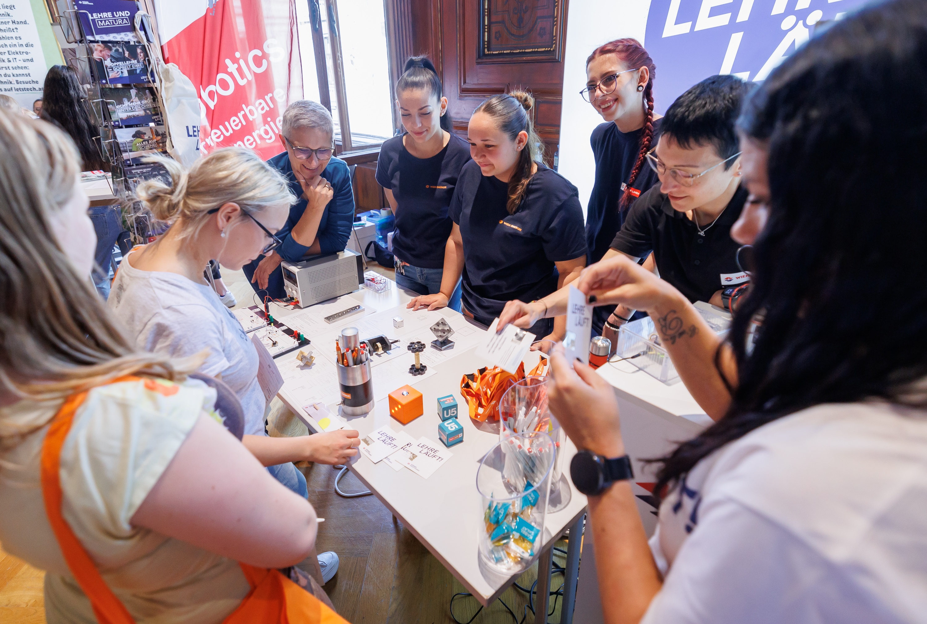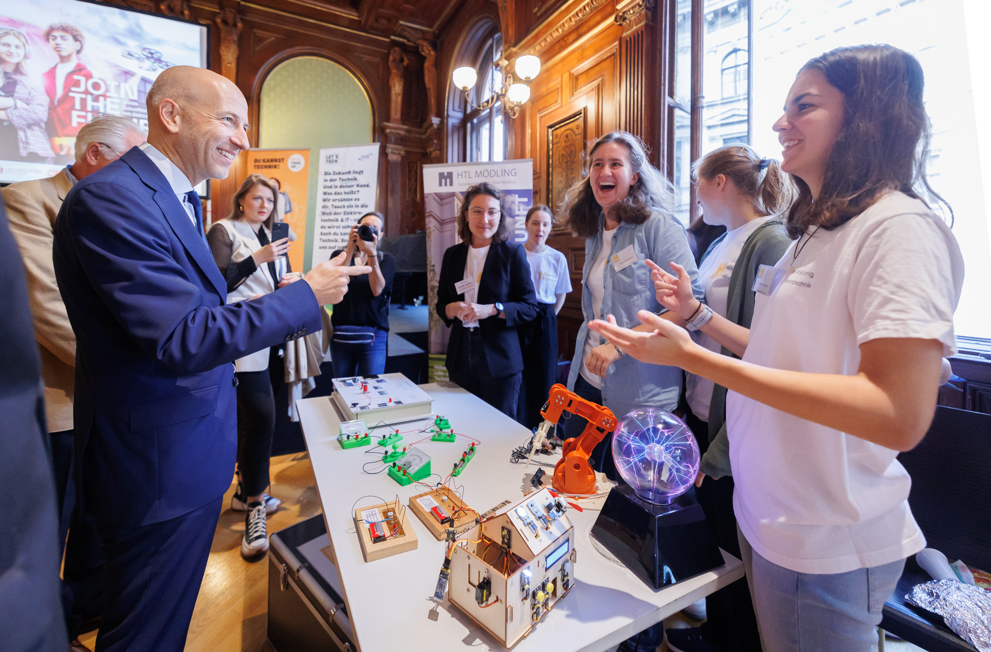 Spannende Mitmachstationen, erfolgreiche weibliche Role Models und sogar ein Bundesminister: Die mittlerweile siebente Ausgabe von Girls! TECH UP war für hunderte Schülerinnen ein Erlebnistag im wahrsten Sinne des Wortes. Rund 700 Mädchen tauchten in die vielfältige Welt der Elektro- und Informationstechnik ein und informierten sich über die Berufe der Zukunft. Auch Bundesminister Martin Kocher mischte sich unter die Besucherinnen.