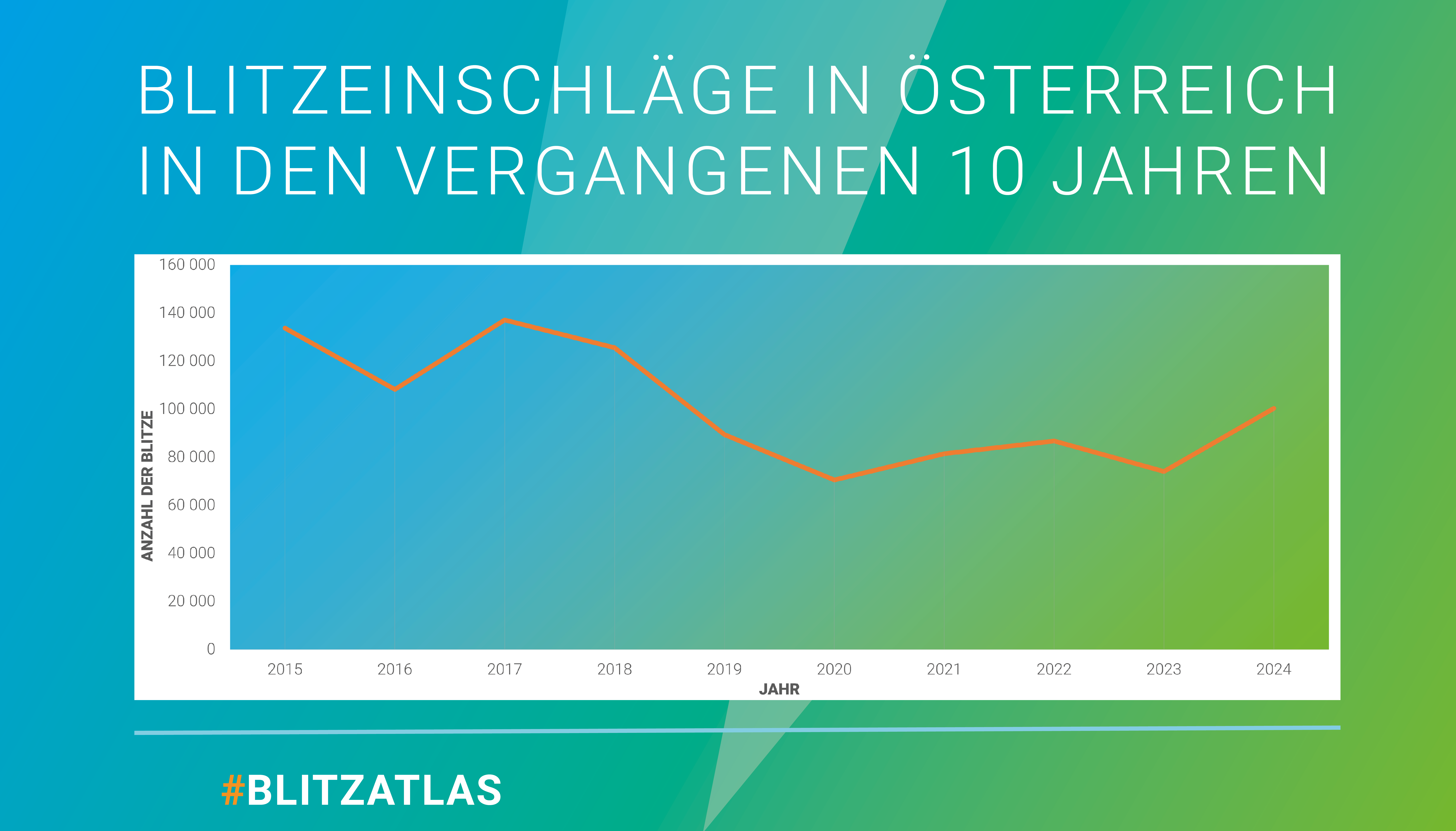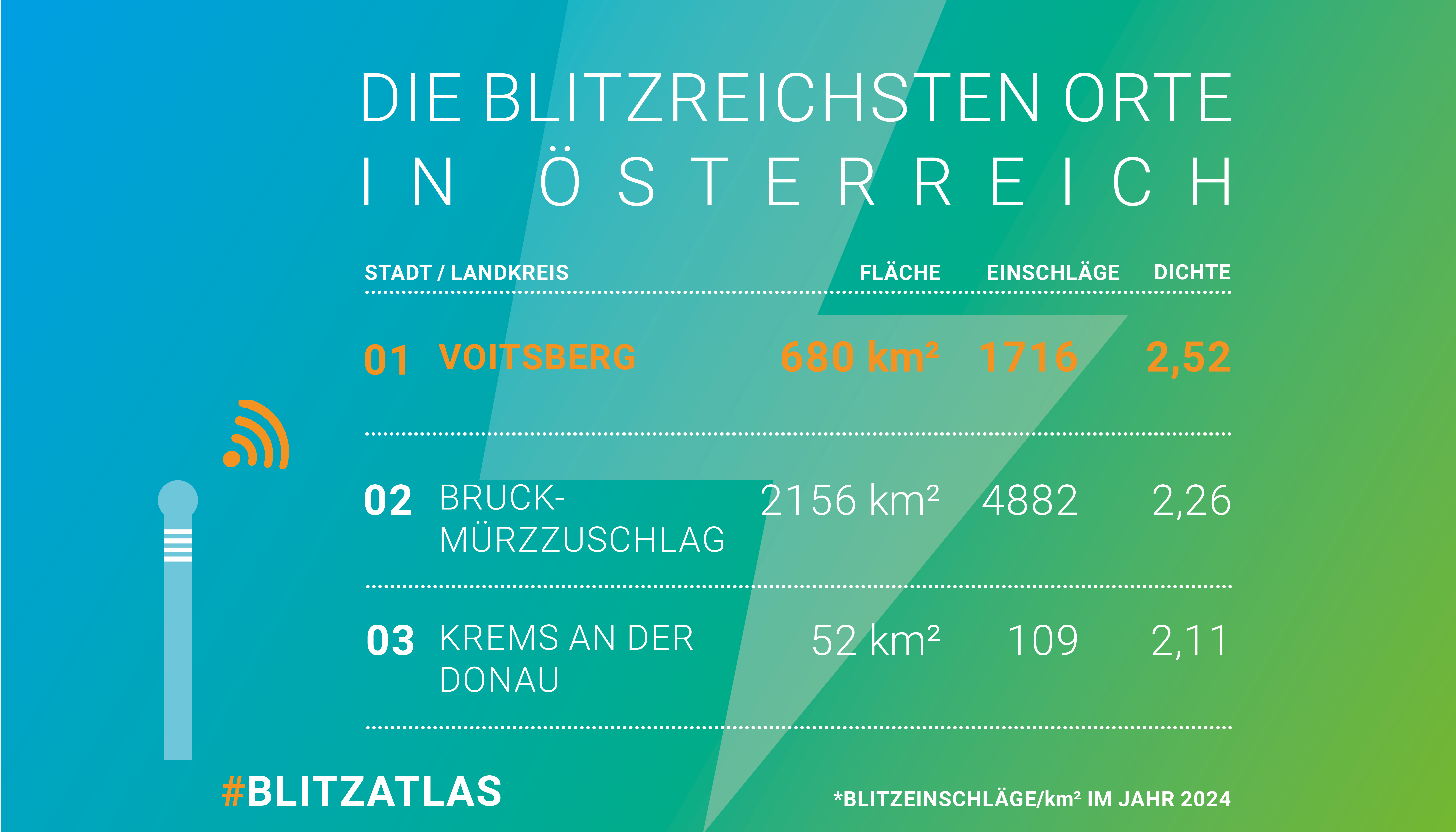 Mit 2,52 Blitzeinschlägen pro Quadratkilometer und Jahr liegt Voitsberg an erster Stelle bei der Blitzdichte, gefolgt von Bruck-Mürzzuschlag (2,26) und Krems an der Donau (Stadt) (2,11). Die geringste Blitzdichte ermittelte der Blitz-Informationsdienst in den Bezirken Steyr (Stadt) mit 0,26 Blitzereignissen pro Quadratkilometer und Jahr sowie in Perg (0,33) und Feldkirch (0,42). Die höchste Blitzdichte unter den Bundesländern verzeichnete wie in den letzten Jahren die Steiermark mit 1,63.