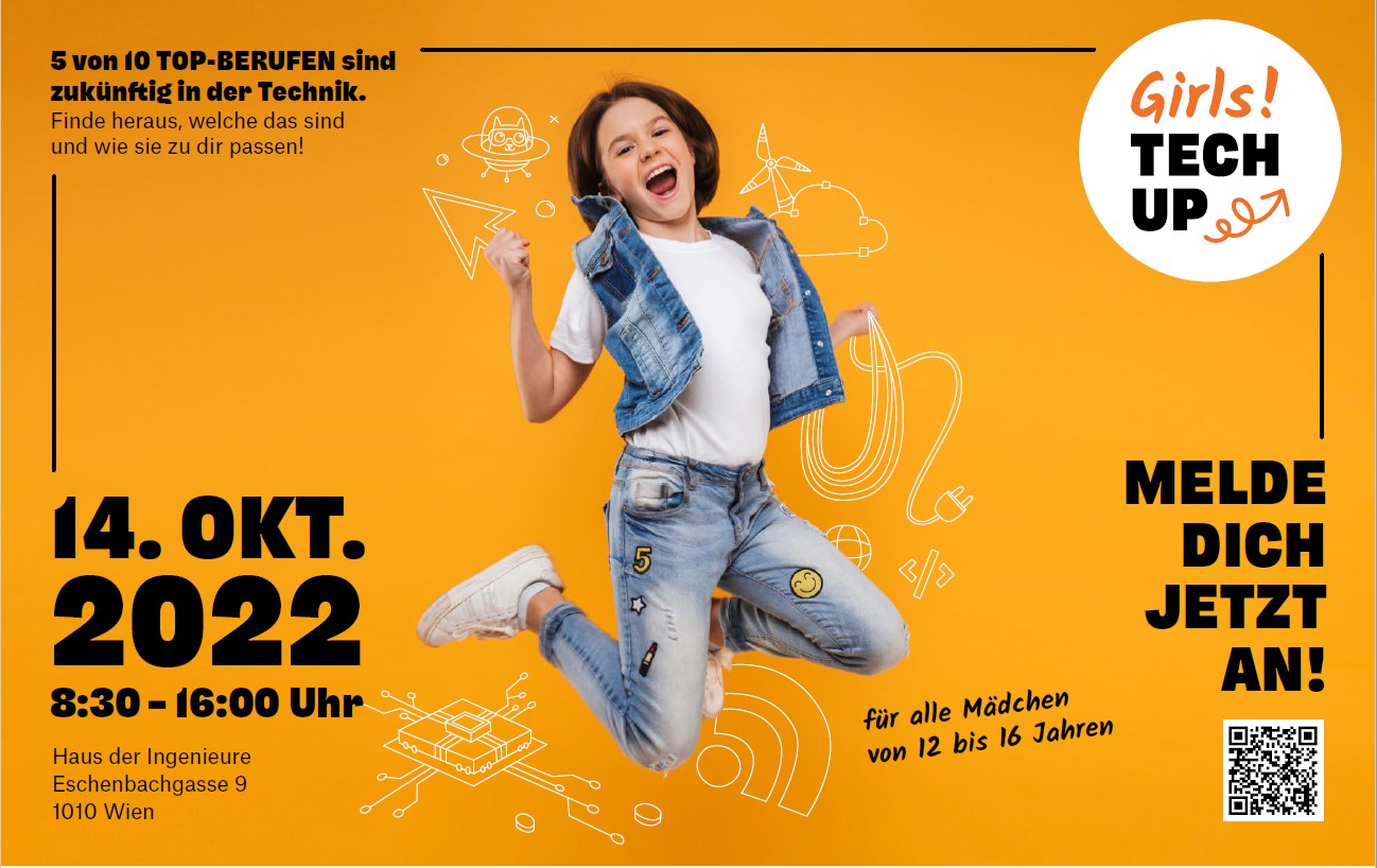 Nach zwei Jahren coronabedingter Pause findet der Erlebnistag Girls! TECH UP diese Woche endlich wieder live und in vollem Umfang statt: Am 14. Oktober können sich Mädchen zwischen 12 und 16 Jahren in Wien über (elektro)technische Berufe informieren, weibliche Vorbilder kennenlernen und ihre Talente testen. Auch Bundesminister Martin Kocher hat sein Kommen zugesagt. Einige wenige Restplätze sind noch zu haben.